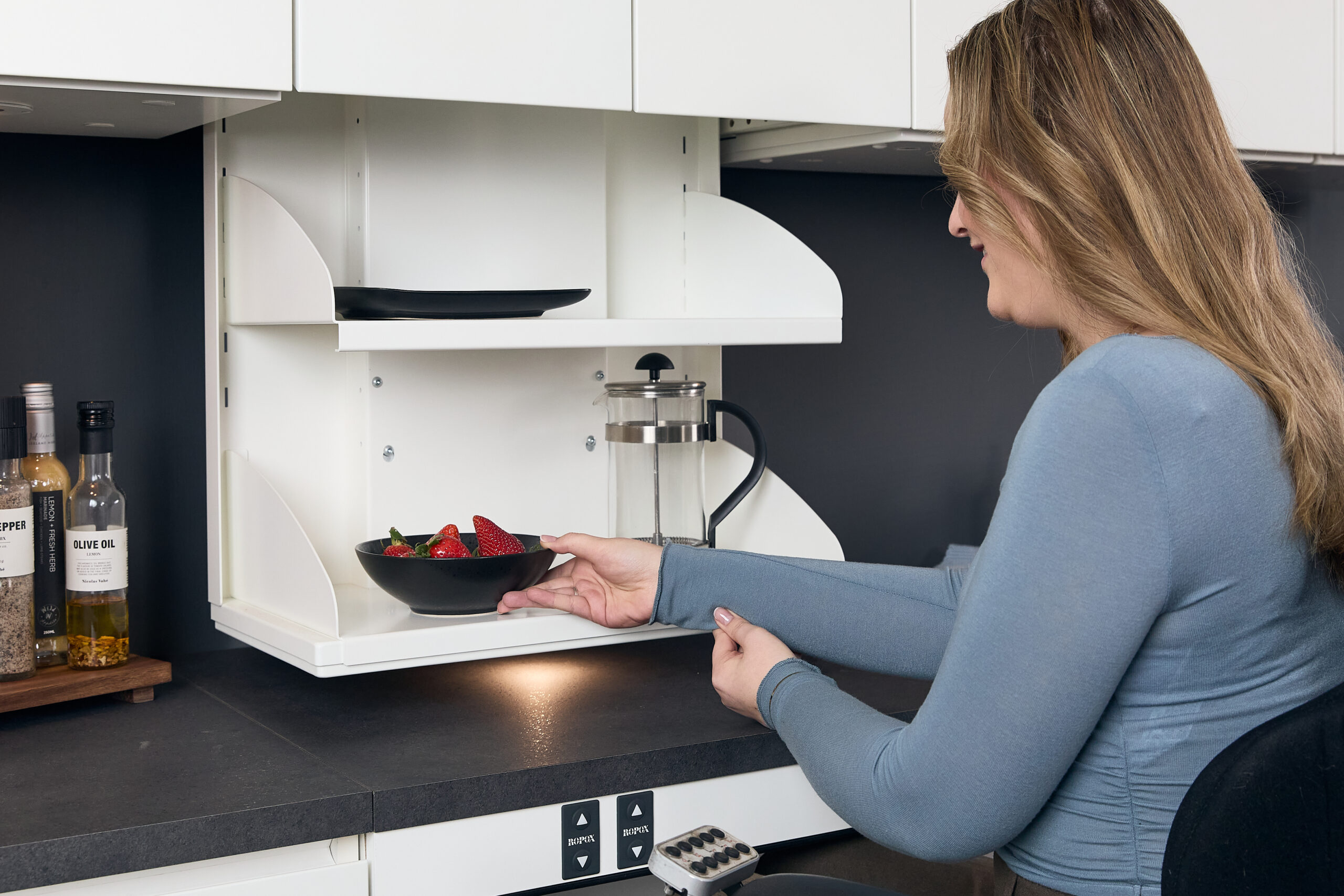 Designing an accessible kitchen for the elderly or people with reduced functional capacity requires flexible solutions. One of these solutions is the height-adjustable upper cabinet, which can be easily lowered, raised, and pulled out from the wall. This ensures that the user can reach the contents without difficulty. The cabinet is operated via a control panel that can be integrated into the countertop for added convenience.