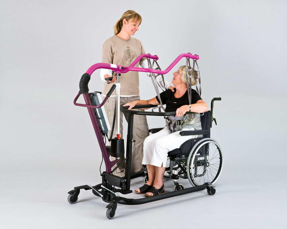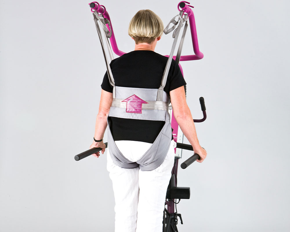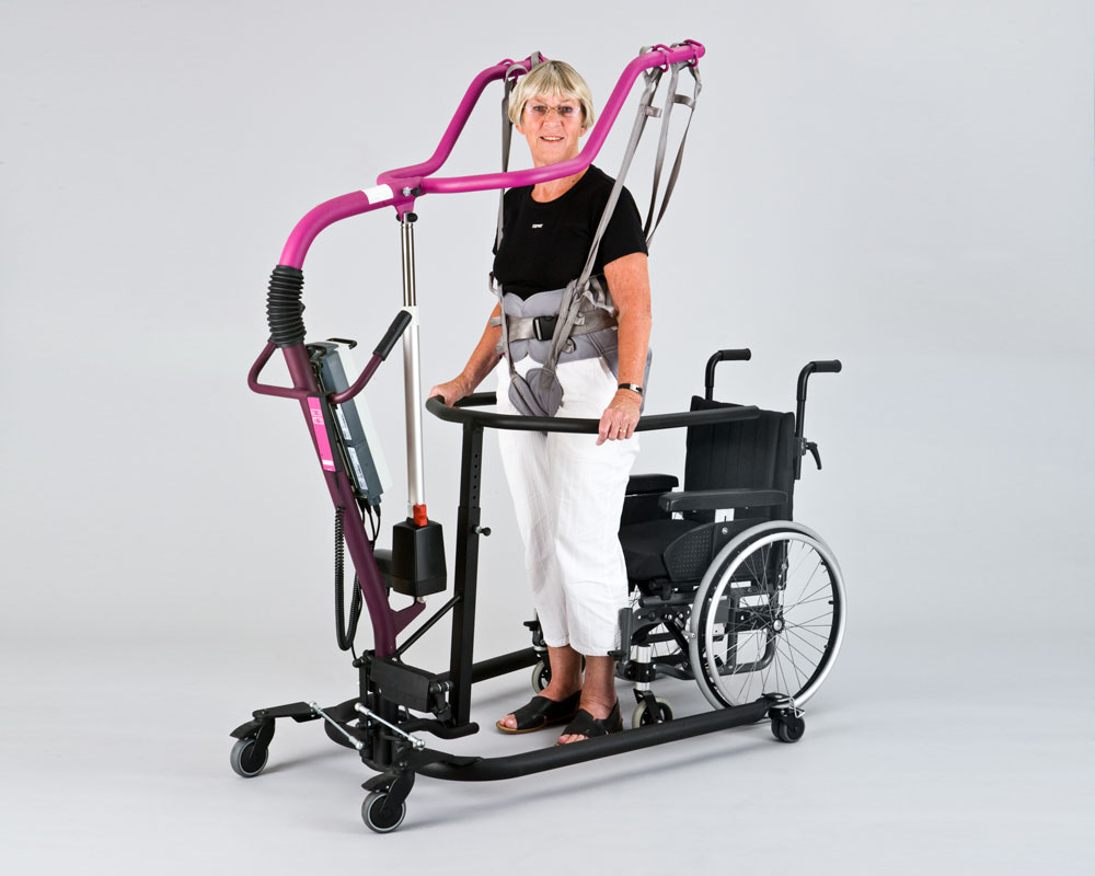 The Walking Trainer is a therapy device that promotes a normal walking pattern by controlling weight bearing, balance and posture during walking therapy. The medical staff, using different slings, can lift people up to 150/200 kg, depending on the chosen variant of lift. The frame from our normal All-in-One provides the basic structure – this means the Walking Trainer can be converted into a patient or stand up hoist. A “forked shaped” lifting bar and “handlebar unit” are mounted to the basic frame to give safe support while allowing the patient to look over the unit when walking. Our special Walking Trainer sling is required to perform the lifting and training.