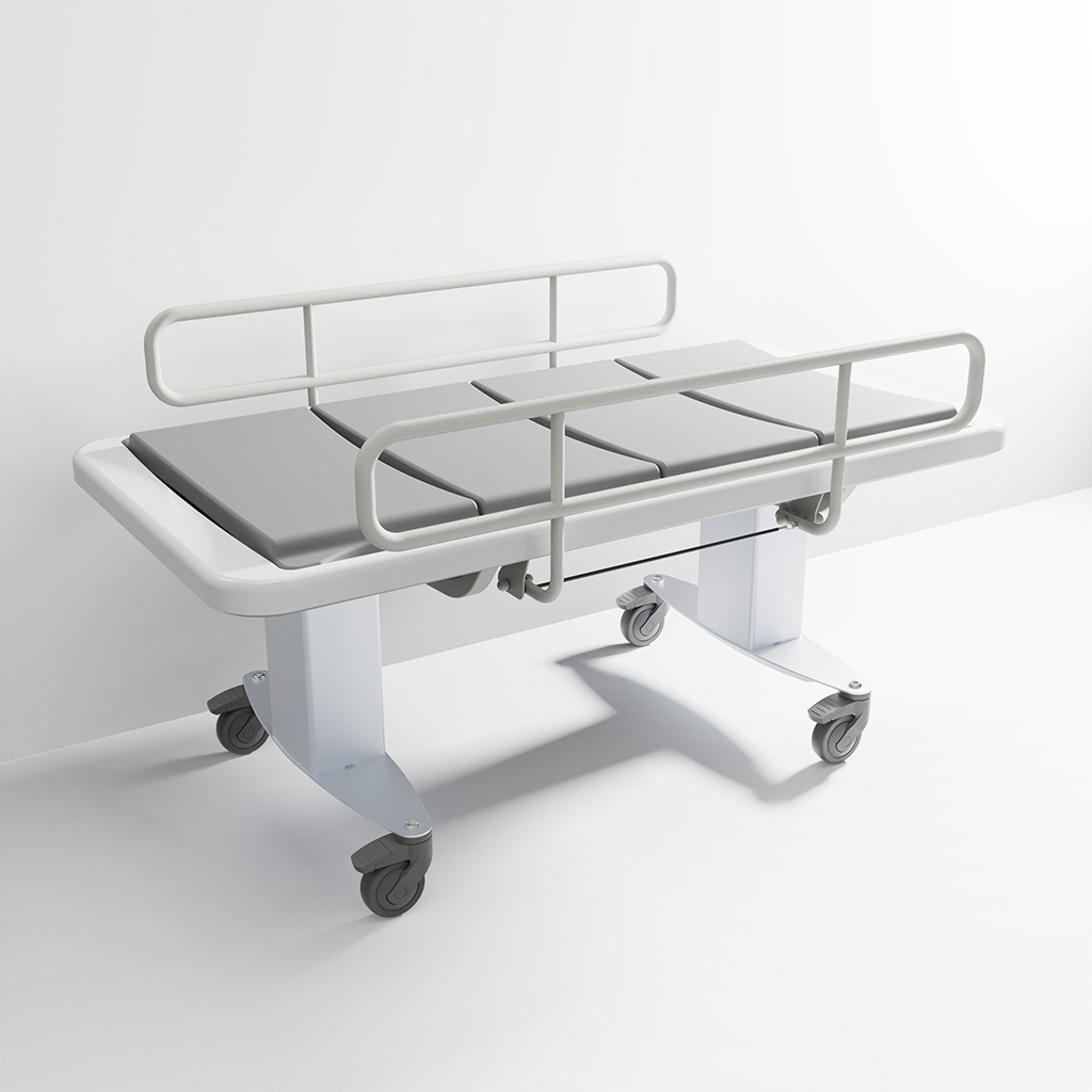The height is adjusted with a hand control, and the shower stretcher comes with a battery solution so you can move it without considering if cords or cables get in the way. It is also possible to mount a central brake system so the carers can brake the shower bed easily and quickly.