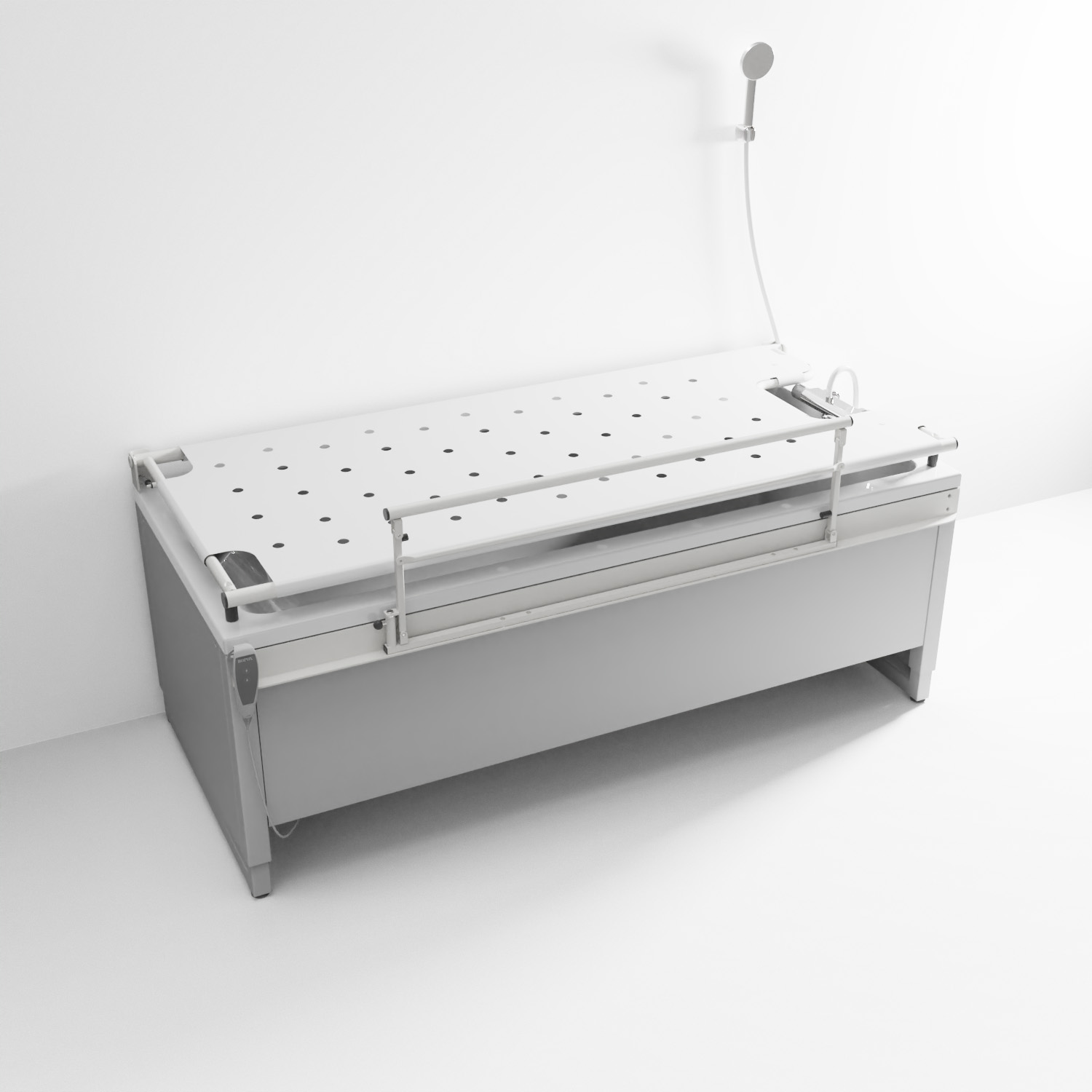 Bathtub with electric 30 cm height adjustment. The bathtub is operated with a hand control. Available in three different lengths.
