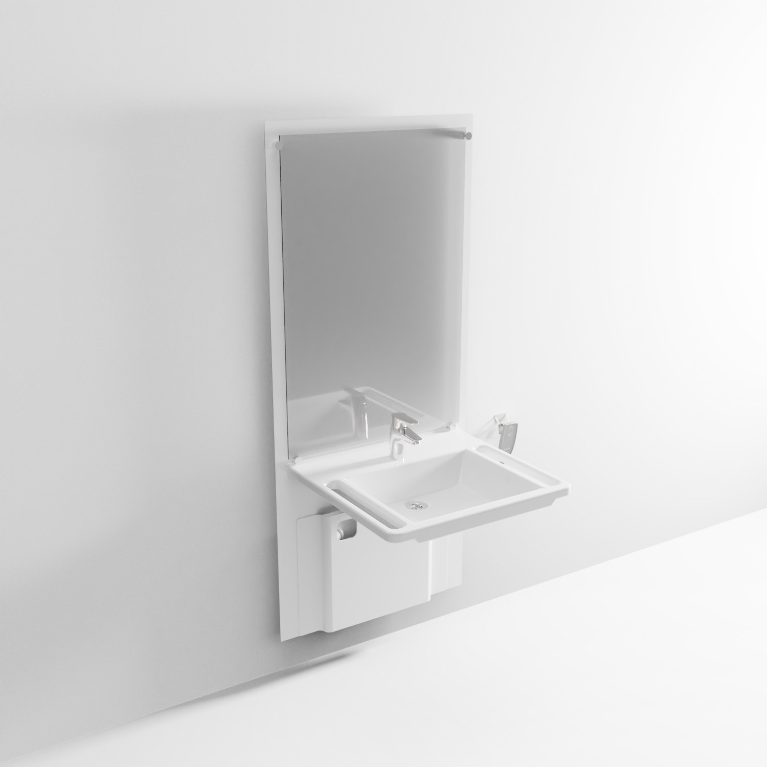 The SlimLine is an electric height adjustable (30 cm) washbasin-unit with a combined mirror. The mirror is therefore always at the right height no matter if you are sitting in a wheelchair or standing up. The SlimLine washbasin unit takes up 8 cm from the wall.
