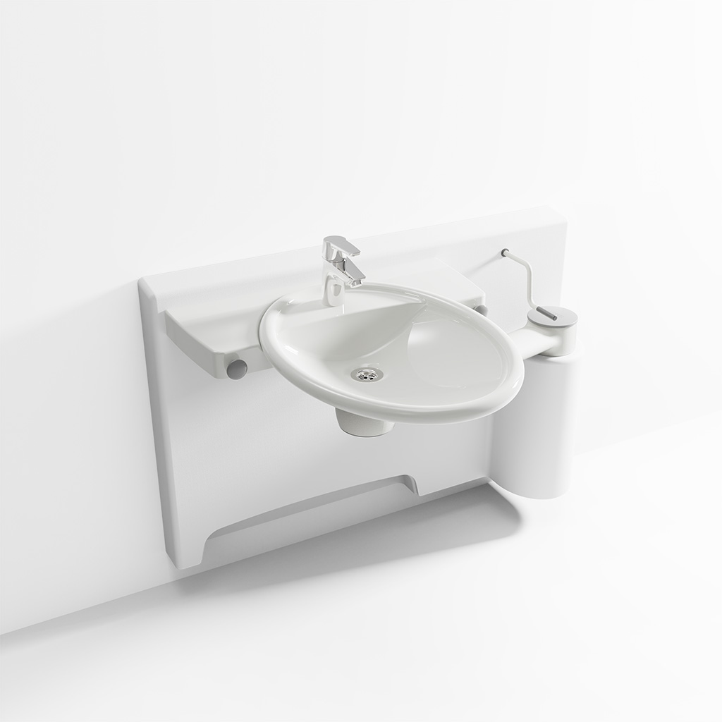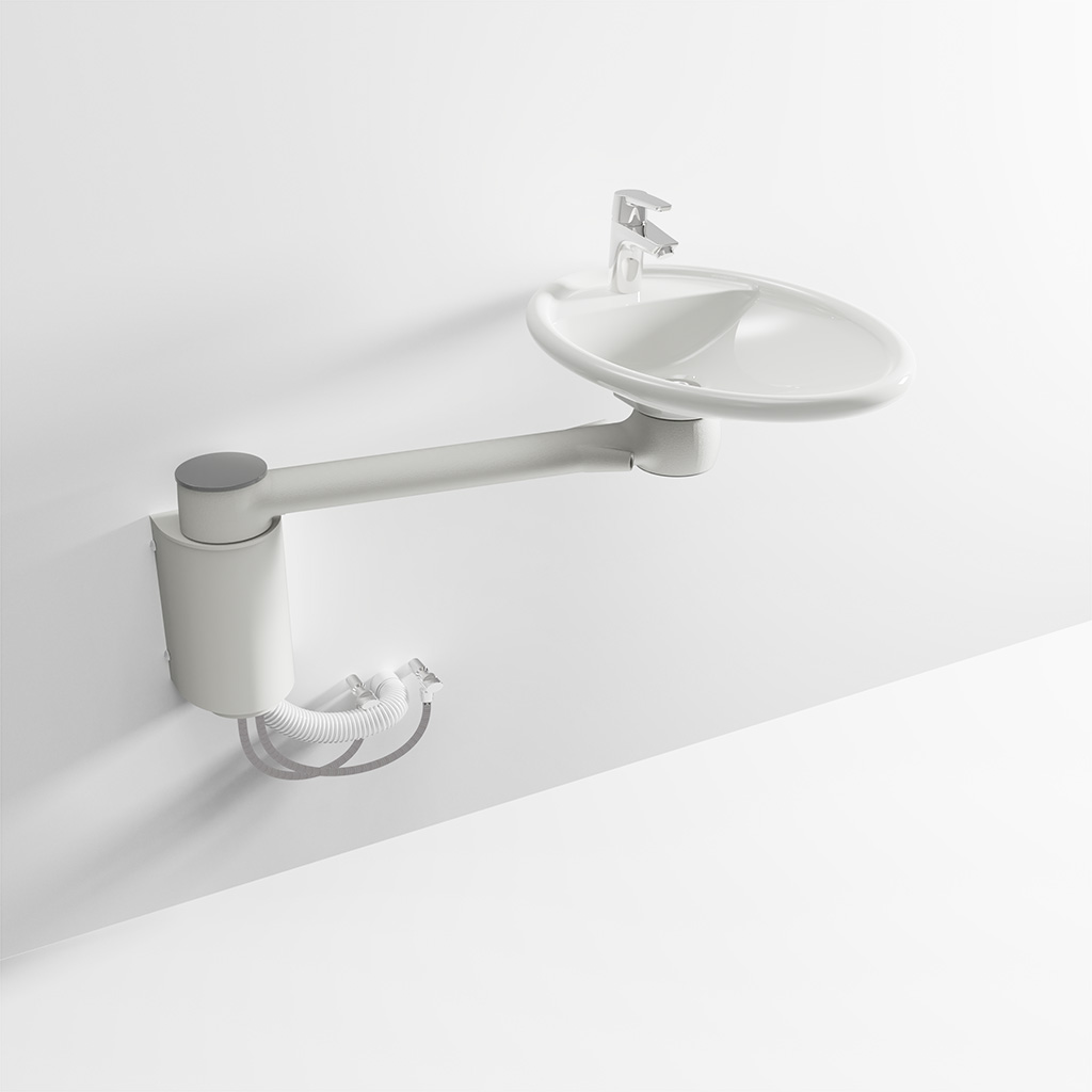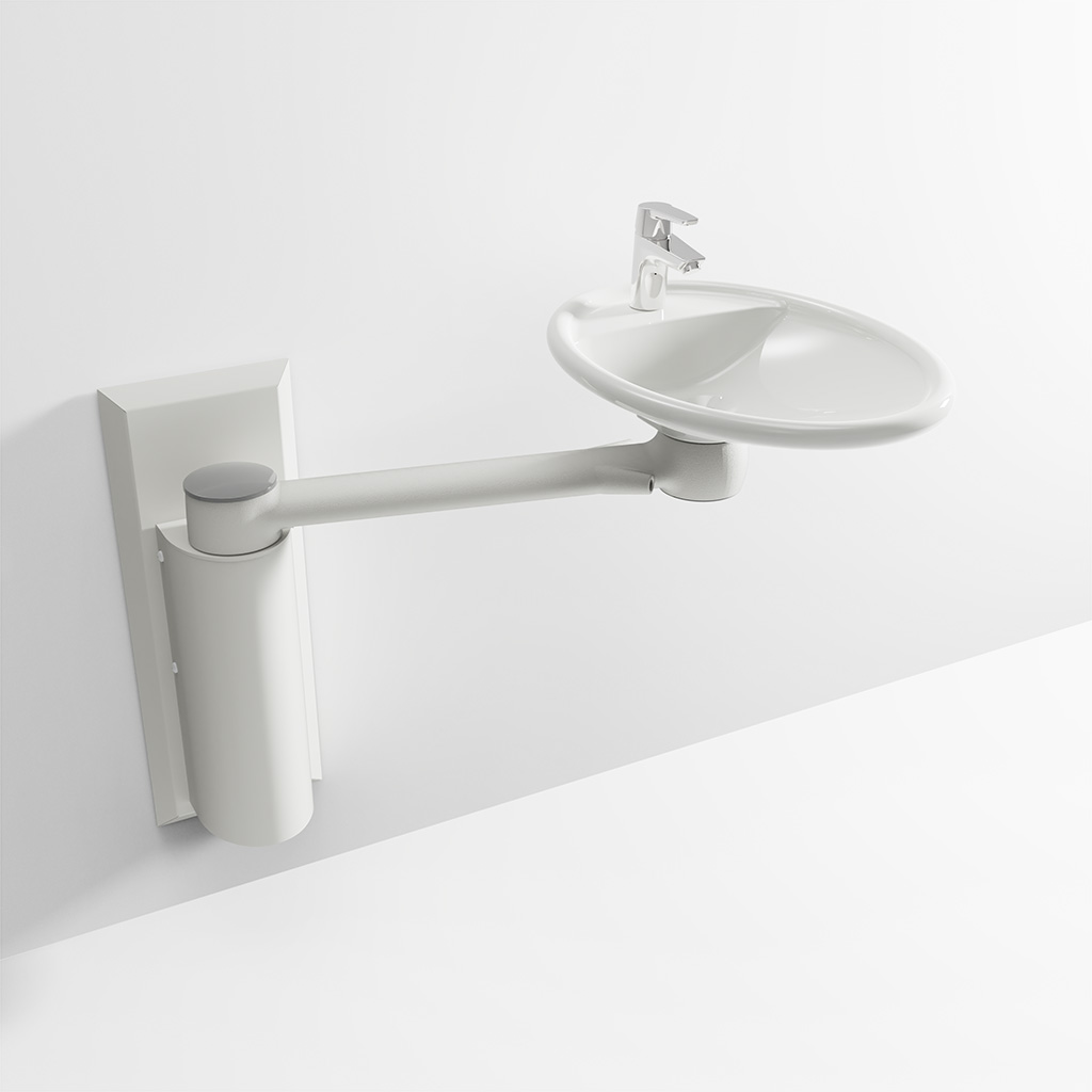 The Swing Washbasin is a washbasin which can be swung with 180 ̊ to the user, which makes it possible for the user to wash hands before leaving the toilet. This increases the hygiene, makes the user more self-reliant and gives the assistant better working conditions. The Swing washbasin is available with manual height adjustment. Depending on the model, the height adjustment range is 15 cm for models without dock-in and 20 cm for models with dock-in. This means that the user and carer can set the level of the sink to the height that fits the user’s needs. The height adjustment also makes the sink suited for both standing and seated use.