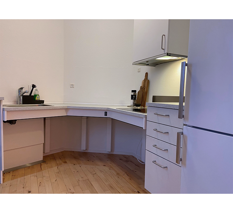 In the kitchen, Alexander chose a height-adjustable Flexi+ table frame for his worktop, and no base cabinets were fitted. Now, he can adjust the kitchen worktop to a suitable height, and he has a good sitting position when using the worktop, tap or hotplates.