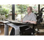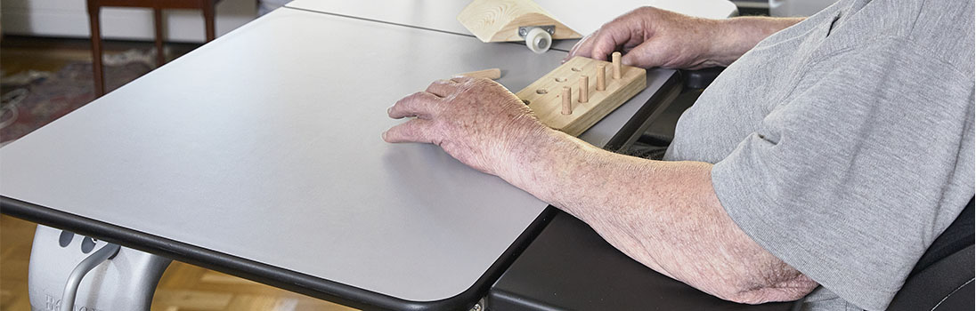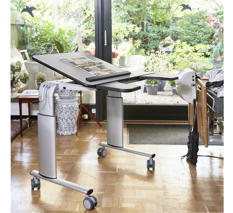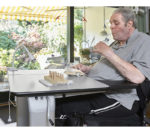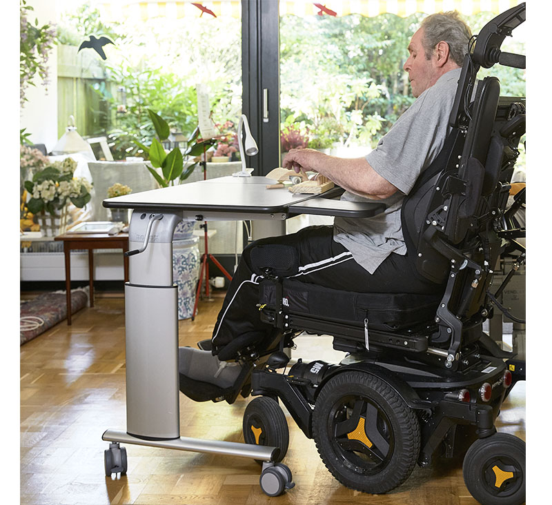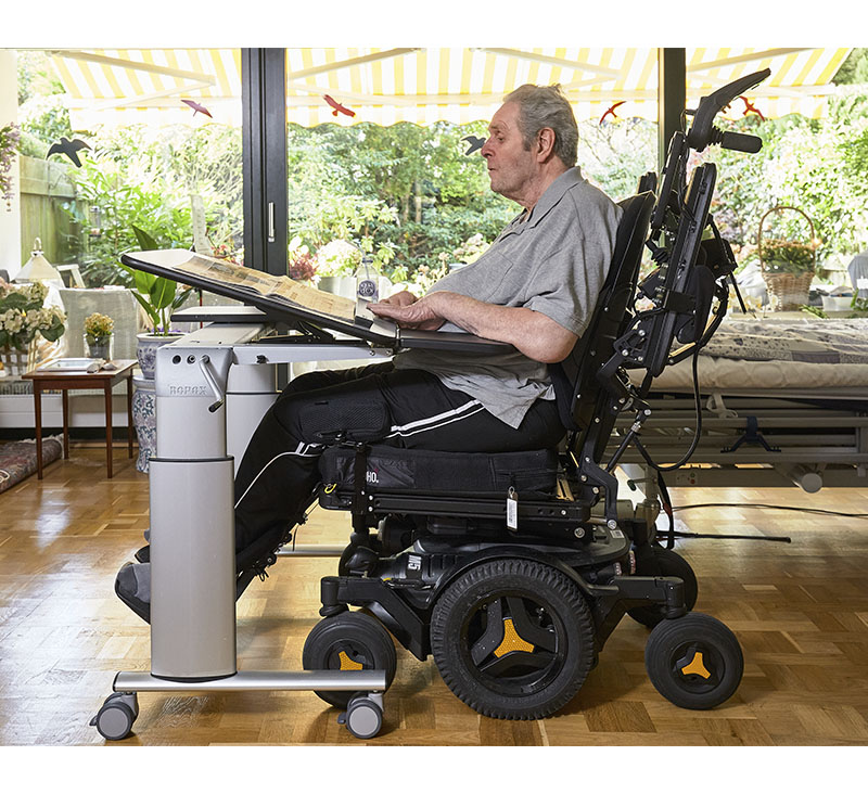 into private homes. For Jan, the Vision table is perfect because it can be adjusted in height and because the tabletop can be raised to an angle where he can read and turn the pages. The arm supports provide good support for the body, and he can get a comfortable sitting position because he can get close to the table.